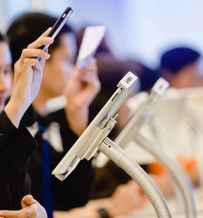 Attendees may scan their mobile device at the touchless registration kiosk to check in automatically.